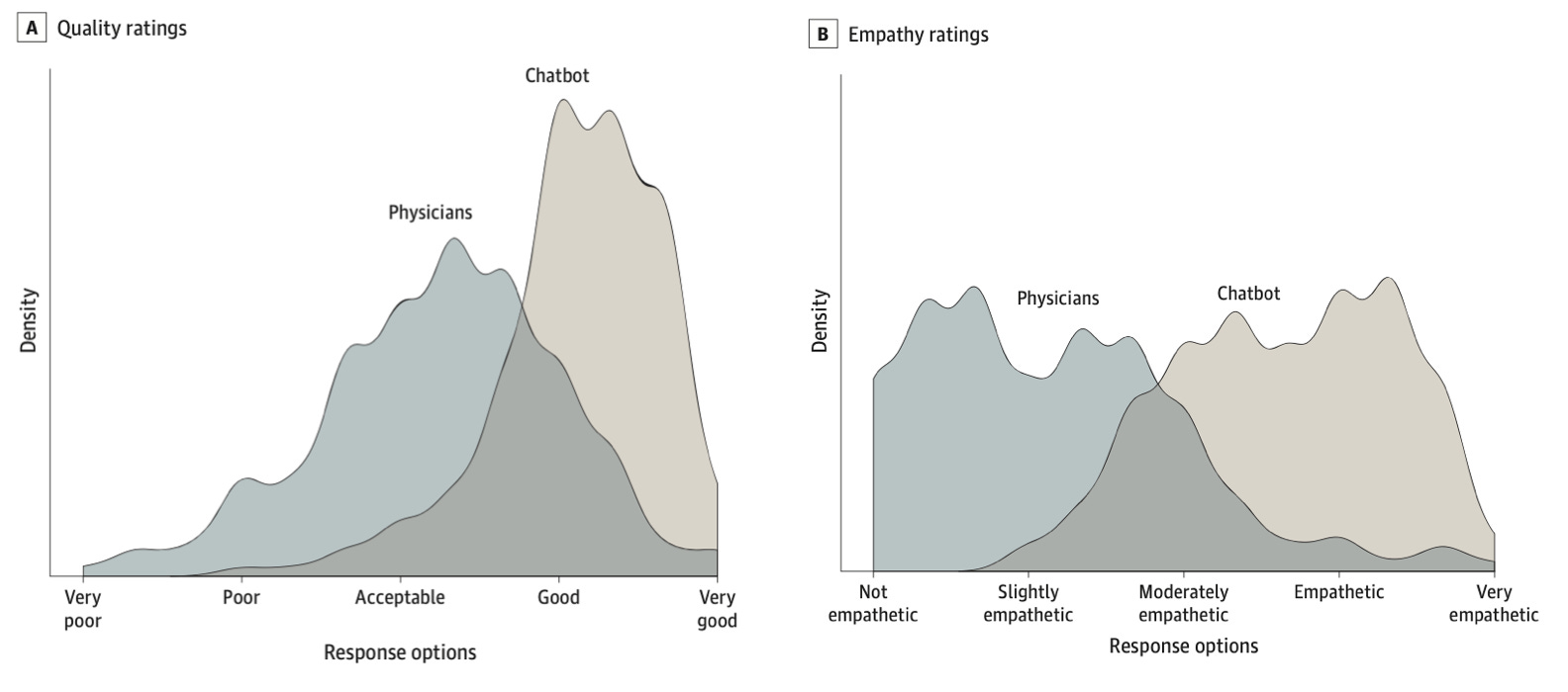 ChatGPT was not only more accurate, it was accurate more often. Further, it was dramatically more empathetic. It was ten times more likely to be rated “moderately empathetic” to “very empathetic” when compared with the doctors’ responses.